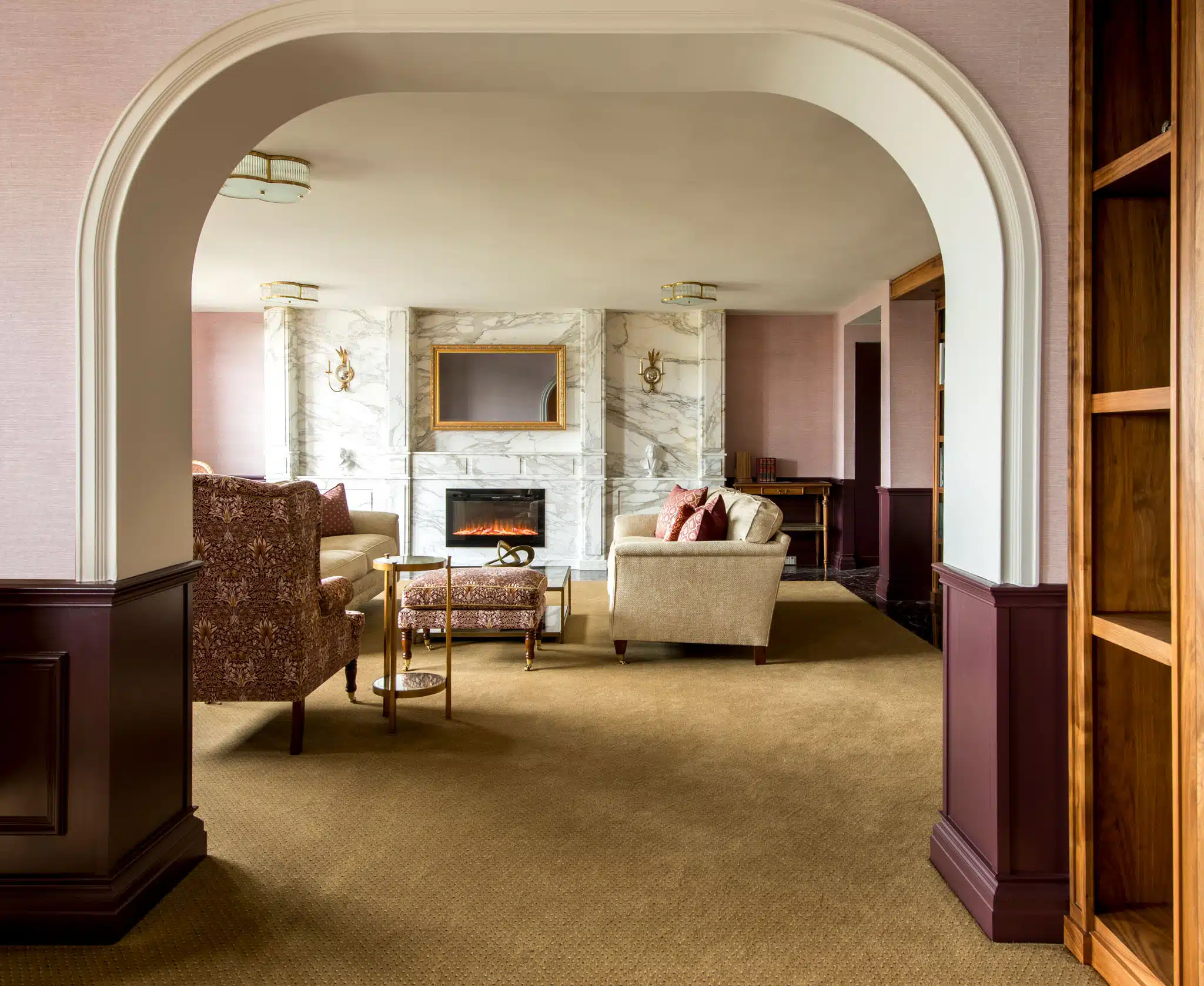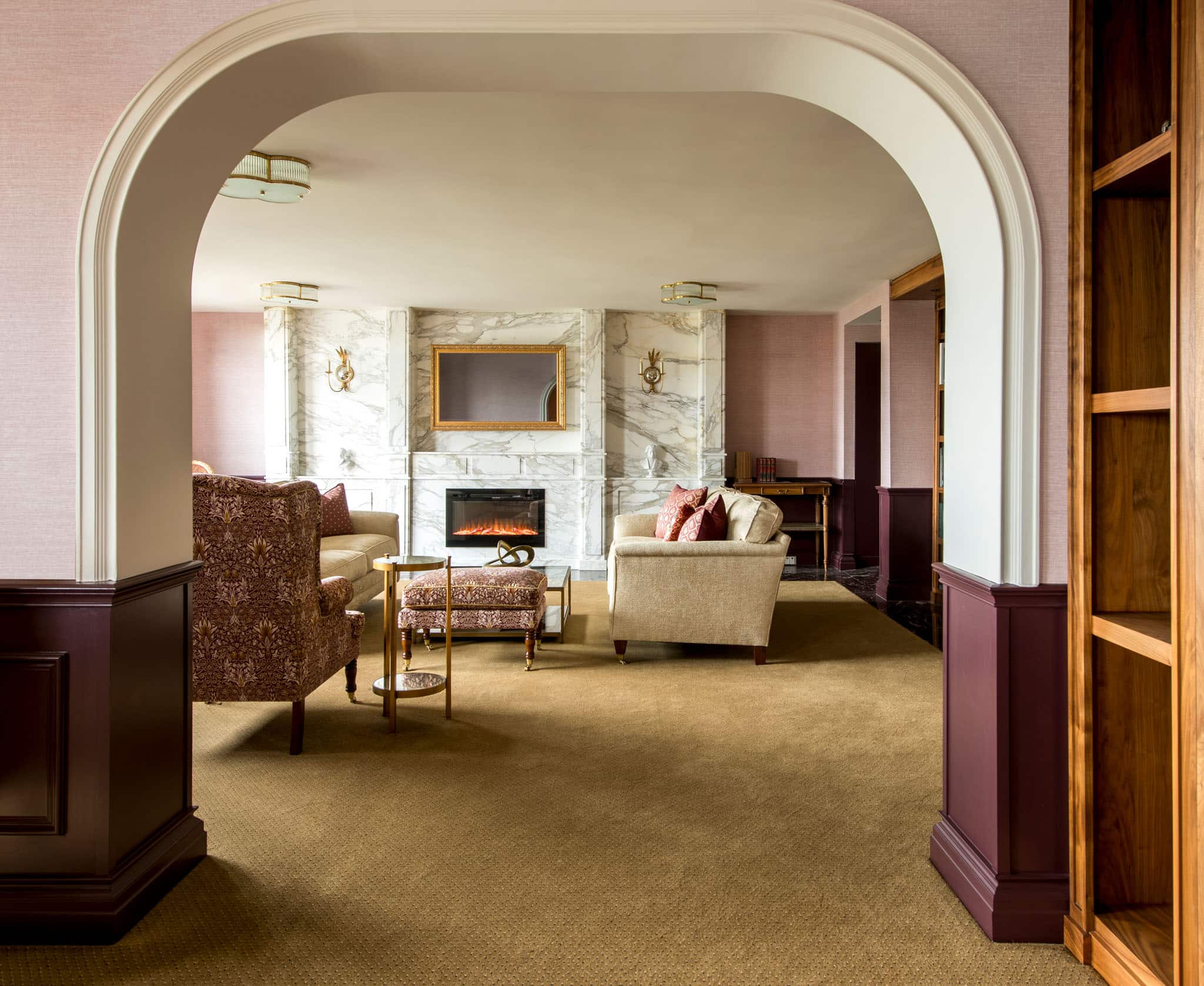 One of Tennille’s first moves was to soften the new arch linking what’s now a library and living area on one side to a dining/meeting area/office on the other. Moulded plasterwork adds depth to the arch as well as a sense of monumentality. The fireplace in the library was designed, with new marble wall and niches, framed by American oak joinery. Tennille also added new drapes, grass weaved wallpapers and wainscot timber work to further add depth. Plush carpet replaced the former linoleum floors. The galley-style kitchen and two powder rooms were also designed, with marble walls and benches, American oak shelves, brass Versace tapware and joinery painted in a rich mulberry hue. The marble itself needed to be taken up the many flights of stairs as each piece was too large to fit in the lift.